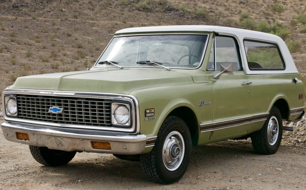 This 1971 Chevrolet K5 CST Blazer 4×2 was delivered new to Riverton Motor Company in Utah and was acquired by the seller in 2015 from the reported second owner. The truck is finished in Medium Olive with a white removable hardtop over a Saddle vinyl interior and powered by a 350ci V8 paired with a three-speed automatic transmission. Additional equipment includes a push-button AM/FM radio, chrome bumpers, faux wood molding, air conditioning, and bucket seats. Service under current ownership has consisted of a tune-up and replacement of the water pump, thermostat, brake master cylinder, and carburetor.