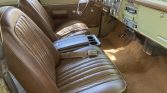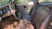 The cabin features front bucket seats and a rear bench seat upholstered in Saddle embossed vinyl joined by a matching dashboard cover, side and rear door panels, and carpet. Amenities include a center console with cup holders, an AC Delco push-button AM/FM radio, rear seat armrest ashtrays, and air conditioning. The air conditioning condenser has been rebuilt. The spare tire is mounted in the rear cargo area.