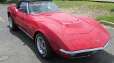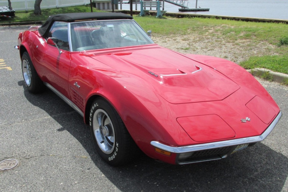 This 1971 Chevrolet Corvette convertible is finished in red over black vinyl and is powered by a numbers-matching 454ci LS5 V8 mated to a four-speed manual transmission. Equipment includes a black convertible top, a black vinyl removable hardtop, 15″ rally wheels, power-assisted four-wheel disc brakes, split chrome bumpers, a trunk-mounted luggage rack, pop-up headlights, air conditioning, and a push-button AM/FM radio. The car resided in Illinois and New Jersey before it was acquired by the current owner in May 2002.