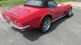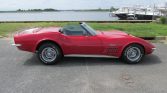This 1971 Chevrolet Corvette convertible is finished in red over black vinyl and is powered by a numbers-matching 454ci LS5 V8 mated to a four-speed manual transmission. Equipment includes a black convertible top, a black vinyl removable hardtop, 15″ rally wheels, power-assisted four-wheel disc brakes, split chrome bumpers, a trunk-mounted luggage rack, pop-up headlights, air conditioning, and a push-button AM/FM radio. The car resided in Illinois and New Jersey before it was acquired by the current owner…