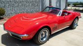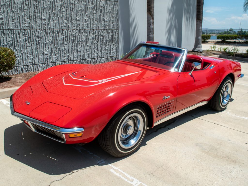 This 1971 Chevrolet Corvette convertible is finished in Mille Miglia Red over matching vinyl upholstery and is powered by a numbers-matching 350ci LT-1 V8 paired with a four-speed manual transmission and a Positraction differential. Equipment includes power steering, four-wheel disc brakes, a Corvette-branded radio, and a white convertible top. The car was built in St. Louis, Missouri, in March 1971 and originally delivered to Aero Chevrolet in Alexandria, Virginia, and it reportedly remained with its original owner…