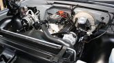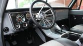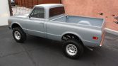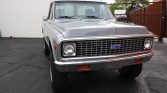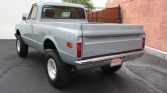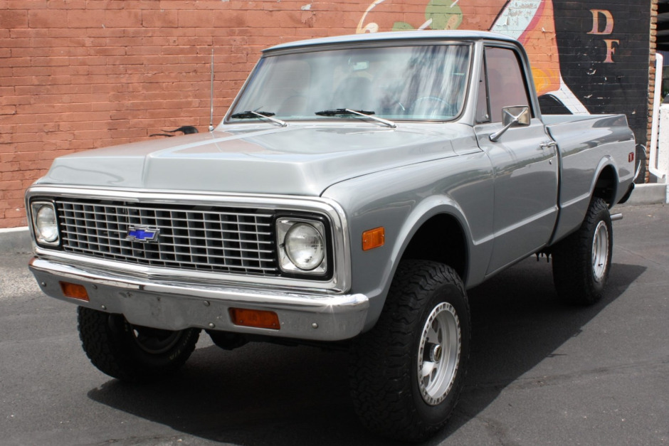 This 1971 Chevrolet K10 is a short-bed 4×4 pickup has been refinished in silver over two-tone black and gray leather, and power is supplied by a replacement 350ci V8 paired with a three-speed automatic transmission and a dual-range transfer case. Other modifications include 17″ KMC wheels with all-terrain tires, a 4″ suspension lift, front disc brakes, power steering, Holley fuel injection, a Vintage Air HVAC system, and a Kenwood stereo with Bluetooth connectivity.