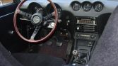 The interior features black vinyl upholstery on the front bucket seats and diamond-stitched vinyl along the transmission tunnel and on the walls of the rear cargo area. Equipment includes a heater, a push-button AM radio, a wooden shift knob, patterned floor mats, and rear cargo straps.