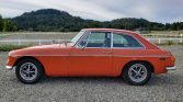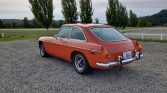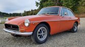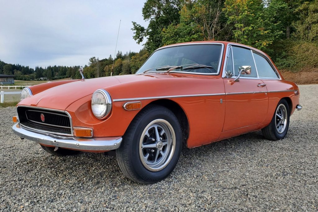 The Pininfarina-designed body is finished orange and features chrome bumpers with rear bumperettes, polished window trim, a passenger-side fender-mounted rearview mirror, MGB GT badging, and pop-out rear quarter windows.
