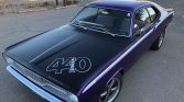 Delivered new in In-Violet (FC7), the car was refinished in Plum Crazy during prior ownership according to the seller. Features include a matte hood and window surround treatment, chrome bumpers, white side stripes, and “440” graphics.