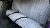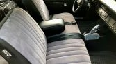 Black vinyl upholstery with gray cloth inserts covers the dual bench seats. Additional modifications include a B&M shifter, an Alpine CD stereo, and an AutoMeter tachometer mounted behind the three-spoke steering wheel. The car is equipped with a fold-down front armrest as well as lap belts for the front and rear occupants.