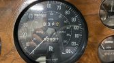 The wood-rimmed steering wheel frames a 130-mph speedometer, a 6k-rpm tachometer, and gauges for amperage, fuel level, coolant temperature, and oil pressure. The five-digit odometer shows under 83k miles, approximately 15k of which were added during current ownership.