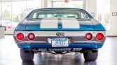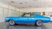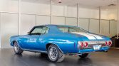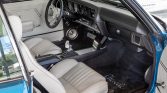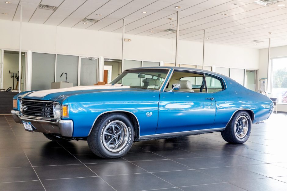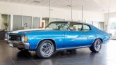 This 1972 Chevrolet Chevelle SS is finished in blue with white stripes over white vinyl and powered by a replacement 454ci V8 paired with a 4L60 four-speed automatic transmission and Ford 9″ rear axle. The engine was rebuilt and modified with a FAST fuel injection system and MSD ignition in 2004, and a refurbishment in 2010 included repainting the body, rechroming the trim, and installing a Compushift transmission controller, Hotchkis suspension, BAER disc brakes, and a Vintage Air air conditioning system. Additional equipment consists of 15″ steel wheels, xenon headlights, and a Pioneer stereo.