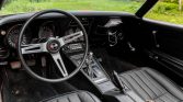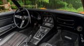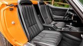 The bucket seats are upholstered in black vinyl and are complemented by a matching dashboard, console, door panels, and carpeting. Amenities include air conditioning, a polished shift knob, and retractable lap belts.