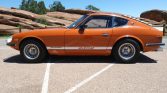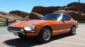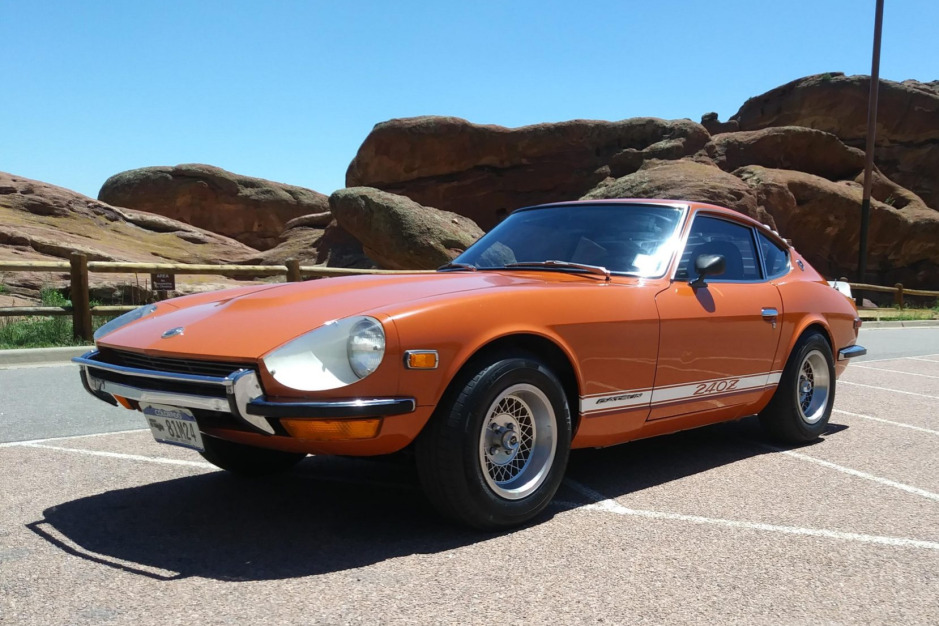 This 1972 Datsun 240Z was first sold in Tennessee and was acquired by the seller in 1973, and it subsequently spent time in Arizona and Colorado. The car was reportedly owned and modified when new by Charles A. “Buz” Standefer, with additions including a rear spoiler, striping, rear window louvers, headlight covers with white-painted buckets, an eight-track player, 14″ Ansen alloy wheels, and exhaust headers. The car is finished in orange over black vinyl upholstery and powered by a 2.4-liter inline-six mated to a four-speed manual transmission, and additional equipment includes Boge Mulholland shock absorbers and stabilizer bars.