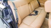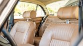 The cabin features tan leather upholstery on the seats and door panels along with matching carpets and wood paneling on the dashboard. Amenities include power windows, ashtrays, and a Kenwood cassette stereo with a trunk-mounted CD changer.