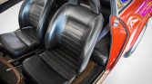 The cabin houses two bucket seats that are fitted with headrests and trimmed in black vinyl along with matching door panels and carpeting. Wood trim accents the dash and amenities include a push-button radio, a heater, a locking glove compartment, and a Valentini Gomma floor mat.