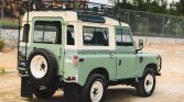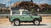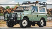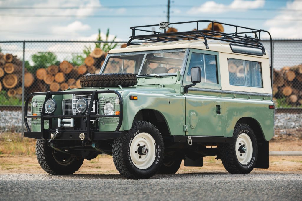 This 1972 Land Rover 88 has been refinished in Pastel Green and Limestone over gray cloth and is powered by a 2.25-liter gasoline inline-four paired with a four-speed manual transmission and a dual-range transfer case. Additional equipment includes a removable hardtop with safari windows, a roof rack, auxiliary lighting, Defender front seats, a front bumper with an integrated brush guard, a fire extinguisher, and a front winch.