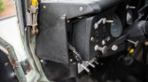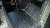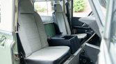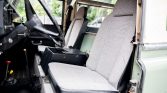 The interior features Defender front seats upholstered in gray patterned cloth joined by two inward-facing bench seats in the cargo area that are upholstered in black vinyl. Interior features include sliding side widows, tire-link floor mats, and a fire extinguisher. Cracks are visible along the black dashboard and the right rear bench seat is torn along the seat bottom.