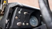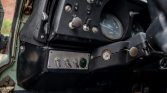 A three-spoke steering wheel fronts Jaeger instrumentation that consists of a 95-mph speedometer and a combination gauge for water temperature and fuel level. Additional gauges for oil pressure and voltage along with an analog clock are located on the lower dash. The five-digit odometer shows 35k miles.