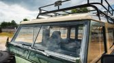 The all-aluminum body was refinished in Pastel Green under prior ownership and features a removable Limestone hardtop with safari windows. Additional exterior details include a roof rack with auxiliary lighting and a rear ladder, a front bumper with an integrated brush guard and Hella Rallye 1000 lights, wire covers on the headlights and tail lights, Land Rover-branded mud flaps, and rock sliders with an integrated step. The PTO-driven front winch is currently disengaged and the seller notes it has not been tested.