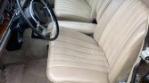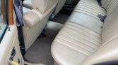 The cabin is trimmed in Parchment MB-Tex with matching door panels and carpets as well as a brown dashboard with woodgrain trim. Equipment includes an under-dash air conditioner, a Becker Europa push-button AM/FM radio, and power windows. The plastic on the driver-side floor mat is peeling, and the column-mounted shifter boot is cracked.