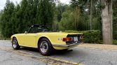 This 1972 Triumph TR6 was acquired by the seller in 1982 and received a cosmetic refurbishment in 2008, including a repaint, interior refreshment, and a replacement soft top. The car is finished in yellow over black vinyl, and power comes from a 2.5-liter inline-six paired with a four-speed manual transmission with overdrive. Equipment includes a black soft top, a bullet-style side mirror, and a cassette stereo.