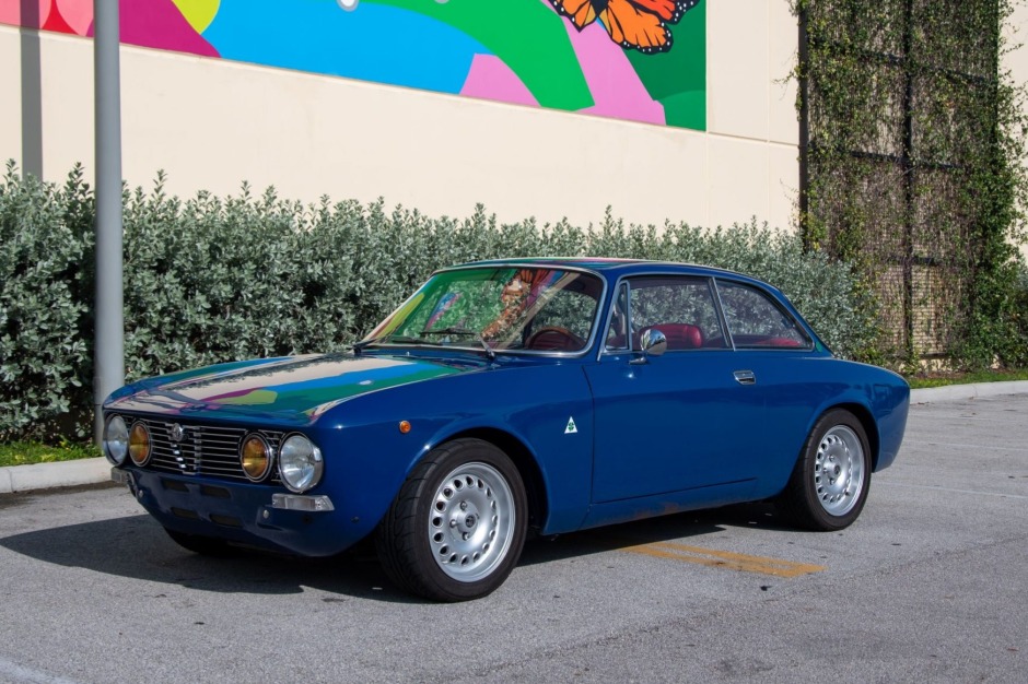 This 1973 Alfa Romeo GTV spent time in Venezuela prior to being acquired by the seller in 2017 and subsequently imported to the US in 2019. The car is finished in blue over red leather upholstery and is powered by a 2.0L twin-cam inline-four paired with a five-speed manual transmission. Equipment includes a ported and polished head, a stainless-steel header and exhaust system, lowering springs, 15” GTA replica wheels, a wood-rimmed steering wheel, and wood trim on the dashboard and door panels.