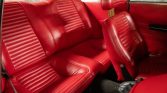 The cabin features seating surfaces upholstered in red leather with matching door panels along with a black dashboard and carpets. Amenities include wood trim, Alfa Romeo-branded floor mats, a wood shift knob, and manual-crank windows. The seller reports the headliner and sun visors have been replaced and three-point seat belts have been installed.