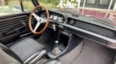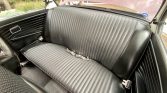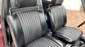 The cabin features black vinyl upholstery over the front buckets and rear bench. Adjustable headrests are fitted for the front passengers, while gray carpets line the floors.