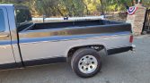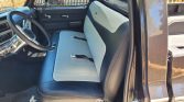 The exterior was repainted to its present scheme of two-tone black and gray under prior ownership. Features include chrome bumpers and side mirrors, tinted windows, and an eight-foot bed. During the refurbishment, the windows, rubber trim, brightwork, fenders, and hood were replaced, and spray-in liner was applied to the bed.