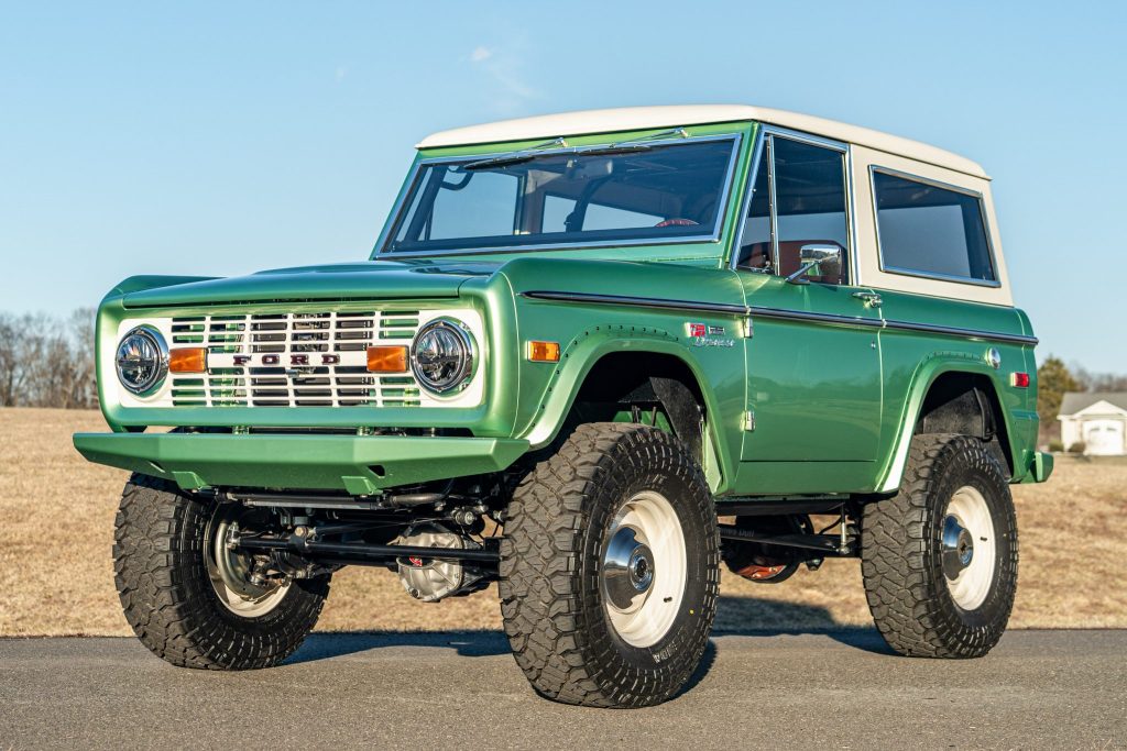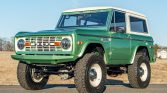 This 1973 Ford Bronco was refurbished and modified with the installation of a Roush-supercharged 5.0L Coyote V8 linked to a 10L80 ten-speed automatic transmission, a twin-stick transfer case, and locking front and rear differentials. The body was refinished in mint green pearl, and the truck rides on a lifted suspension in addition to 17″ steel wheels mounted with 35″ tires. Further equipment includes a removable hardtop, Mile Marker manually locking front hubs, power-assisted disc brakes, LED headlights, power-deployable side steps, and custom-fabricated front and rear bumpers. Inside, the front bucket seats are trimmed in saddle leather and are accompanied by Vintage Air Climate control, Dakota Digital instrumentation, a Flaming River steering column, and a custom audio system.