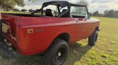 This 1973 International Harvester Scout II was refinished in red over black vinyl and is powered by a 304ci V8 linked to a four-speed manual transmission and a two-speed transfer case. Equipment includes a body lift, power steering, black 15″ steel wheels, a black bikini top, and a roll bar.
