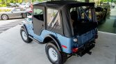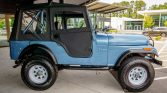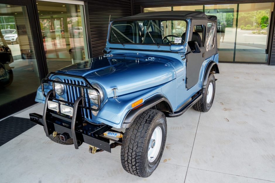 This 1973 Jeep CJ-5 is finished in metallic blue over black black upholstery, and it is powered by a 304ci V8 paired with a three-speed manual transmission and a dual-range transfer case. Equipment includes a black soft top and doors, along with a fold-down front window, a roll bar, nerf bars, receiver hitches, aftermarket suspension components, an Edelbrock intake manifold and carburetor, a Sony CD stereo paired with aftermarket speakers, a brush bar with auxiliary lights, and 15″ Pacer steel wheels with 32″ tires.
