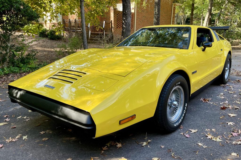 This 1975 Bricklin SV-1 was acquired approximately seven years ago by the current owner and was modified by Fantomworks of Norfolk, Virginia in 2018. Work included lengthening the nose, reinforcing the roof, installing electric actuators for the gullwing doors, and performing a repaint in yellow with a black lower section. The car is powered by a fuel-injected 351ci Ford Windsor V8 paired with a three-speed automatic transmission, and additional features include a custom rear wing, air conditioning,…