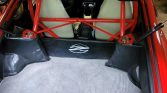 The interior houses high-back bucket seats that are trimmed in white vinyl along with black door panels and carpeting. Appointments include an aftermarket stereo, rubber floor mats, and a body-colored half roll cage.