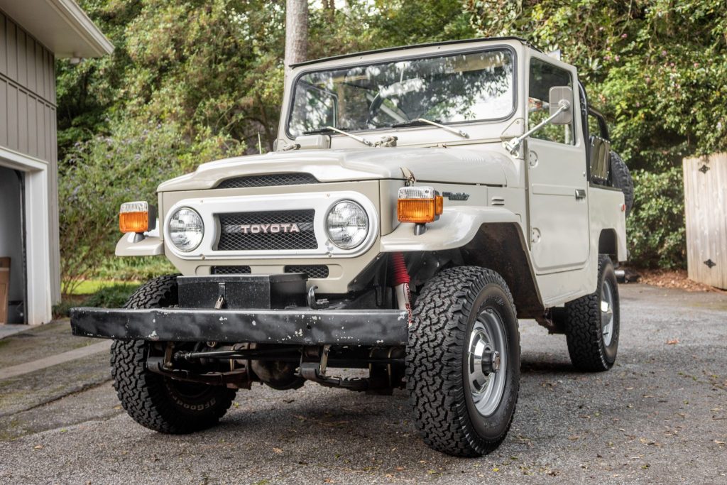 This 1975 Toyota Land Cruiser FJ40 is finished in beige over a gray vinyl interior and is powered by a carbureted 4.2-liter 2F inline-six paired with a four-speed manual transmission and a dual-range transfer case. Additional features include a black vinyl bikini top, a lockable front storage box, a Kenwood head unit, Warn manually-locking front hubs, and Rancho RS9000 shocks. The truck was reportedly refurbished in 2012, and an oil change was carried out earlier in 2021.