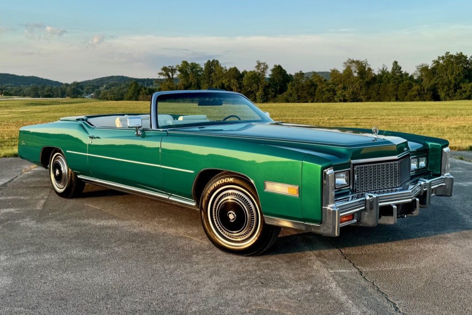 This 1976 Cadillac Eldorado Convertible is finished in Greenbrier Firemist over white Sierra Grain leather and is powered by a 500ci V8 paired with a three-speed automatic transmission. The car is equipped with a white soft top, four-wheel disc brakes, 15″ steel wheels, black wheel covers, a power-adjustable front bench, automatic climate control, automatic headlights, power windows, and an AM/FM stereo with an eight-track player.