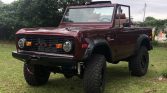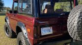 Work during the 2019 body-off refurbishment reportedly included stripping the old finish, replacing corroded panels with new sheet metal, application of bedliner on the inside of the tub, replacing the inner and outer front fenders, installing a body-color roll cage with sunshades, installing new weatherstripping and glass, and applying an epoxy primer before applying the dark red base coat and clear coat. Additional exterior features consist of black fender flares, an aftermarket front bumper with a Warn winch, a rear swing-away tire carrier, and aftermarket lighting.