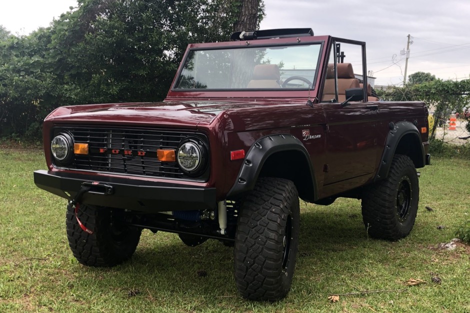This 1976 Ford Bronco was acquired by the seller in 2019 and subsequently underwent a cosmetic and mechanical refurbishment that included repairing and refinishing the body and modifying the suspension and brakes. The truck is finished in dark red over tan leather upholstery and is powered by a 302ci V8 paired with a three-speed automatic transmission and a dual-range transfer case. Features include a body-color removable hardtop, a roll bar, four-wheel disc brakes, a suspension lift kit, 17” wheels with 35” tires, aftermarket bumpers, a Warn winch, bedliner-coated floors, a 23-gallon fuel tank, a locking center console, and a JL audio sound system with a subwoofer mounted in a jerrycan.