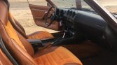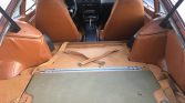 The cabin features bucket seats upholstered in brown vinyl with light brown cloth inserts along with matching door panels and carpets as well as a contrasting black dashboard and center console. Equipment includes air conditioning, a rear window defroster, an aftermarket Alpine cassette stereo, and Audiovox speakers.