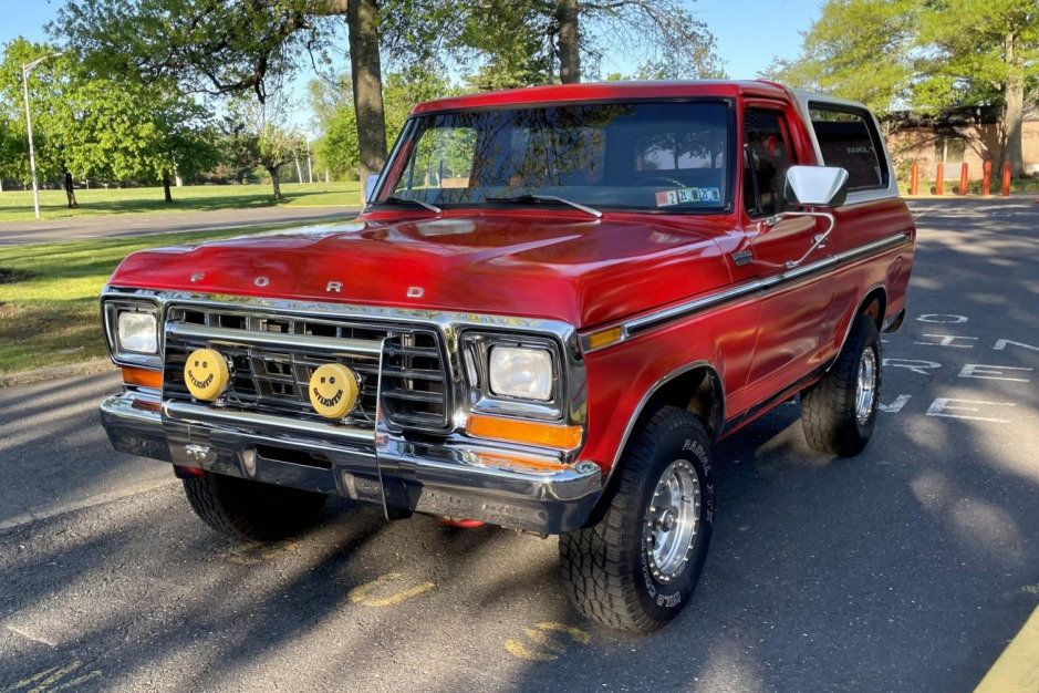 This 1978 Ford Bronco Custom is finished in red with a white removable hardtop over a replacement two-tone black and red interior, and power is from a 351ci V8 paired with a four-speed manual transmission and a dual-range transfer case. Equipment includes a bull bar with KC auxiliary lights, power steering, Mickey Thompson beadlock wheels, bucket seats, and a Kenwood CD stereo. Work performed since December 2020 is said to have included rebuilding the carburetor, adjusting the engine timing, and replacing the rear brakes, front sway bar bushings, and valve cover gaskets.