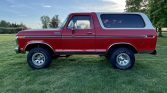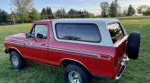 This 1978 Ford Bronco Custom is finished in red with a white removable hardtop over a replacement two-tone black and red interior, and power is from a 351ci V8 paired with a four-speed manual transmission and a dual-range transfer case. Equipment includes a bull bar with KC auxiliary lights, power steering, Mickey Thompson beadlock wheels, bucket seats, and a Kenwood CD stereo. Work performed since December 2020 is said to have included rebuilding the carburetor, adjusting the engine…