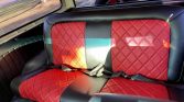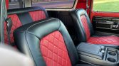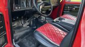 The cabin is finished in the body color features front bucket seats and a rear bench upholstered in replacement black vinyl with custom-made red vinyl inserts that are quilted with black stitching. Equipment includes power steering, a lockable center console with integrated cup holders, and a rubber floor liner. Sound deadening is present below the floor liner, and paint chips are noted in the door jambs.