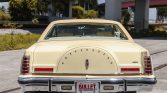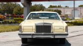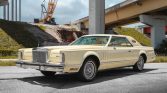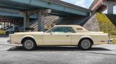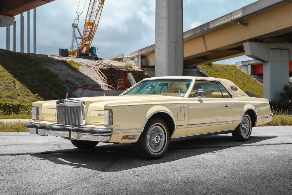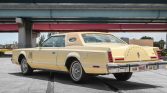 This 1978 Lincoln Mark V is finished in cream over cream/gold leather and is powered by a 460ci V8 paired with a three-speed automatic transmission. Equipment includes a vinyl landau roof, opera windows, auto-dimming hideaway headlights, turbine-style alloy wheels, power windows and door locks, cruise control, and a push-button AM/FM stereo.