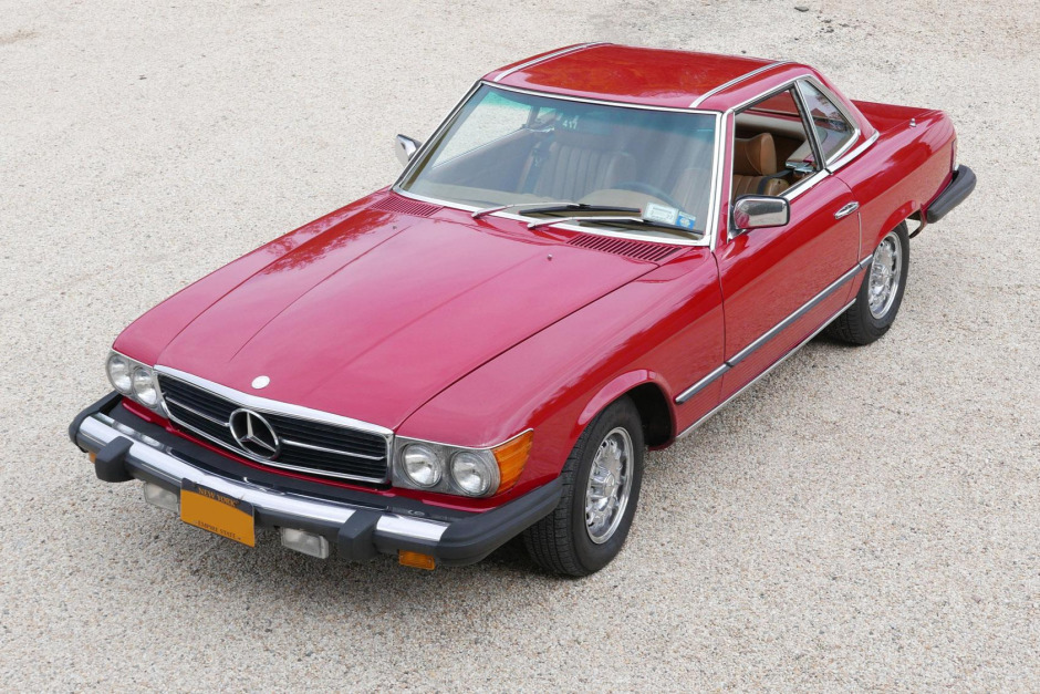 This 1978 Mercedes-Benz 450SL is finished in red over tan MB-Tex upholstery, and it is powered by a 4.5-liter V8 paired with a three-speed automatic transmission. Equipment includes a body-color hardtop, a black soft top, power windows, chrome-finished 14″ alloy wheels, and an older aftermarket Sony stereo. The car was acquired by the seller in 2018, and service in the last two years is said to have included overhauling the brakes and replacing the radiator, serpentine belts,…
