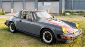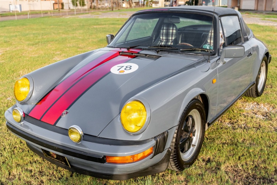 This 1978 Porsche 911SC Targa is powered by a 3.0-liter flat-six paired with a five-speed manual transaxle and finished in steel blue with red stripes over a black interior with plaid seat inserts. Equipment includes a removable targa top, auxiliary driving lights, 16″ Fuchs wheels, a wood-rimmed Moto-Lita steering wheel, and a Sony stereo with a CD changer. The car was first sold in March 1978 in Braunschweig, Germany, and the seller acquired it from a dealer…