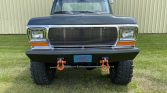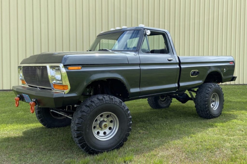 This 1979 Ford F-250 is a standard-cab 4×4 that was refurbished and modified from the seller’s acquisition in 2010 over the following six years. The work included sourcing a 1978 bed and a 1977 cab, a repaint in Ford Guard Metallic, and installation of a 460ci V8 as well as a four-speed NP435 manual transmission and an NP205 dual-range transfer case. Additional equipment includes an aftermarket hood and tailgate, a 6″ lift with Rancho shocks, 16.5″ wheels with 38″ tires, four-wheel disc brakes, fabricated bumpers with recovery points, a Legion Industrial toolbox, a receiver hitch, a truck cover, and a custom split bench seat.