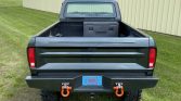 A 1978 bed and a 1977 cab were fitted to the 1979 frame according to the seller, and an aftermarket hood and tailgate were added before a repaint in Ford Guard Metallic. Features include custom-fabricated front and rear bumpers with D-ring shackles as well as a receiver hitch, clearance lights, and exits for the dual exhaust system in both bed sides. The bed is coated in a textured spray-in liner and houses a Legion Industrial toolbox.