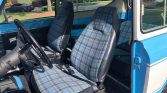 The cabin features front bucket seats and a rear bench that have been reupholstered in black vinyl with plaid fabric centers along with a black dashboard, door panels, and rubber floor mats. Dynamat sound deadening material has reportedly been added by the seller, and amenities include an under-dash air conditioner, a Kenwood AM/FM cassette stereo, and a center console with cupholders.