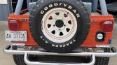 Aftermarket 15″ alloy wheels wear 33×12.5″ Uniroyal Laredo A/T tires. The suspension is equipped with an aftermarket lift and steering stabilizer, and a steel wagon wheel spare wearing an older Goodyear Tracker A-T tire is included on a rear-mounted carrier.