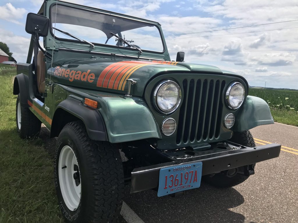 A reproduction body tub was installed with replacement body mounts during current ownership and is finished in metallic green with orange Renegade graphics. A set of tan cloth full doors, the factory soft top, a tan bikini top, and the removed rear tire carrier are included in the sale.