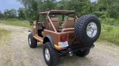 A YJ tub was reportedly fitted to the CJ frame during the refurbishment, sheet metal repairs were performed, and the body was repainted brown and fitted with replacement graphics sourced from Phoenix Graphix. The exterior seals, mirrors, windshield, and wipers are said to have been replaced at that time, and additional features include a tan canvas bikini top attached to the roll bar, a swing-away spare tire carrier, black wheel arch extensions, aftermarket black-finished bumpers, and twin exhaust outlets.