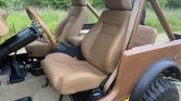 The cabin houses bolstered Smittybilt front seats with a rear bench trimmed in tan vinyl along with a matching dash pad and beige carpeting. Additional features include rubber floor mats, a locking center console, a glove compartment, and a Lokar shifter.