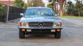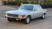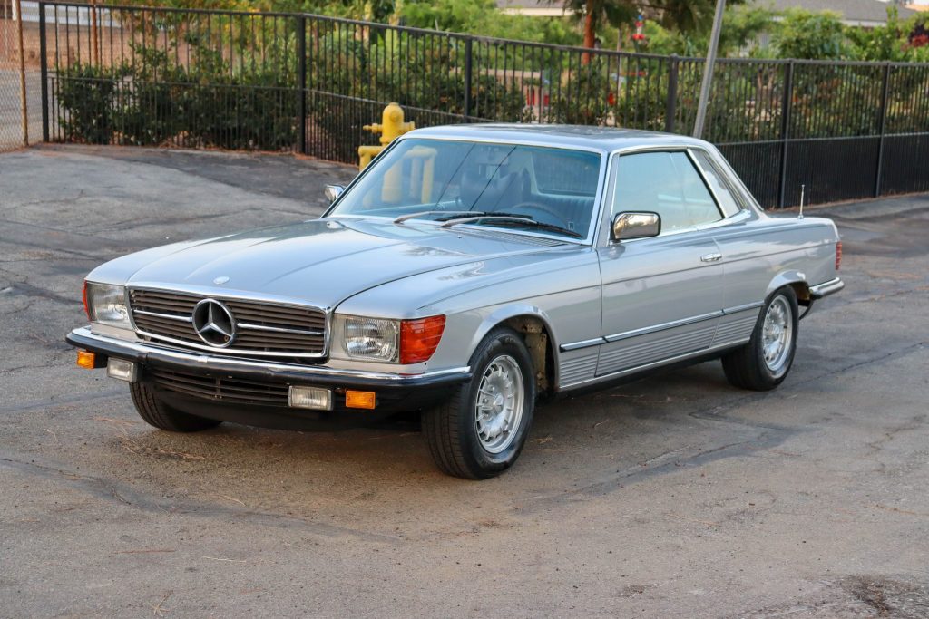 This 1979 Mercedes-Benz 450SLC is finished in Astral Silver over blue leather and is powered by a 4.5-liter V8 paired with a three-speed automatic transmission. The car is fitted with European-market bumpers and headlights, and factory equipment includes automatic climate control, cruise control, power windows, a sunroof, Bundt wheels, and a Becker Mexico cassette stereo. The wheels were painted in preparation for the sale.